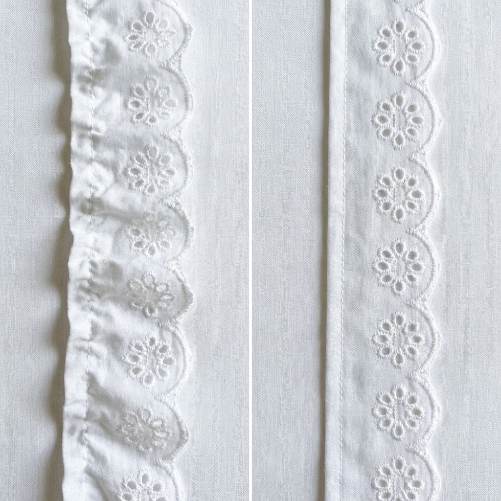 Flat eyelet trim lies completely smooth against your fabric, which makes it ideal for precise, structured applications like cuffs, collar edges, or decorative surface details. Gathered trim adds fullness and dimension wherever it’s applied. Knowing which one your project calls for before you buy saves a lot of confusion at the cutting table.