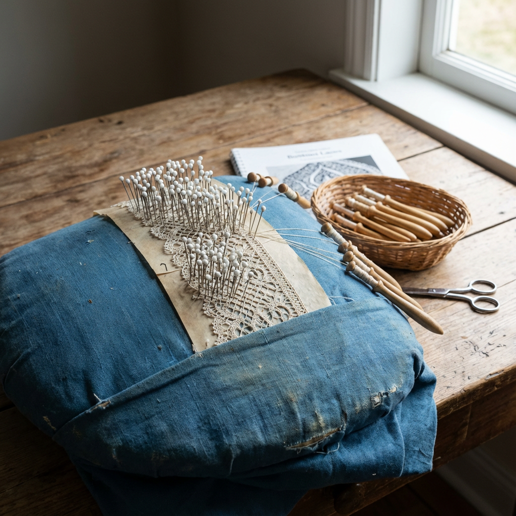 For your first project, use a simple Torchon ground pattern. It uses straight lines and repeating motions — perfect for learning.