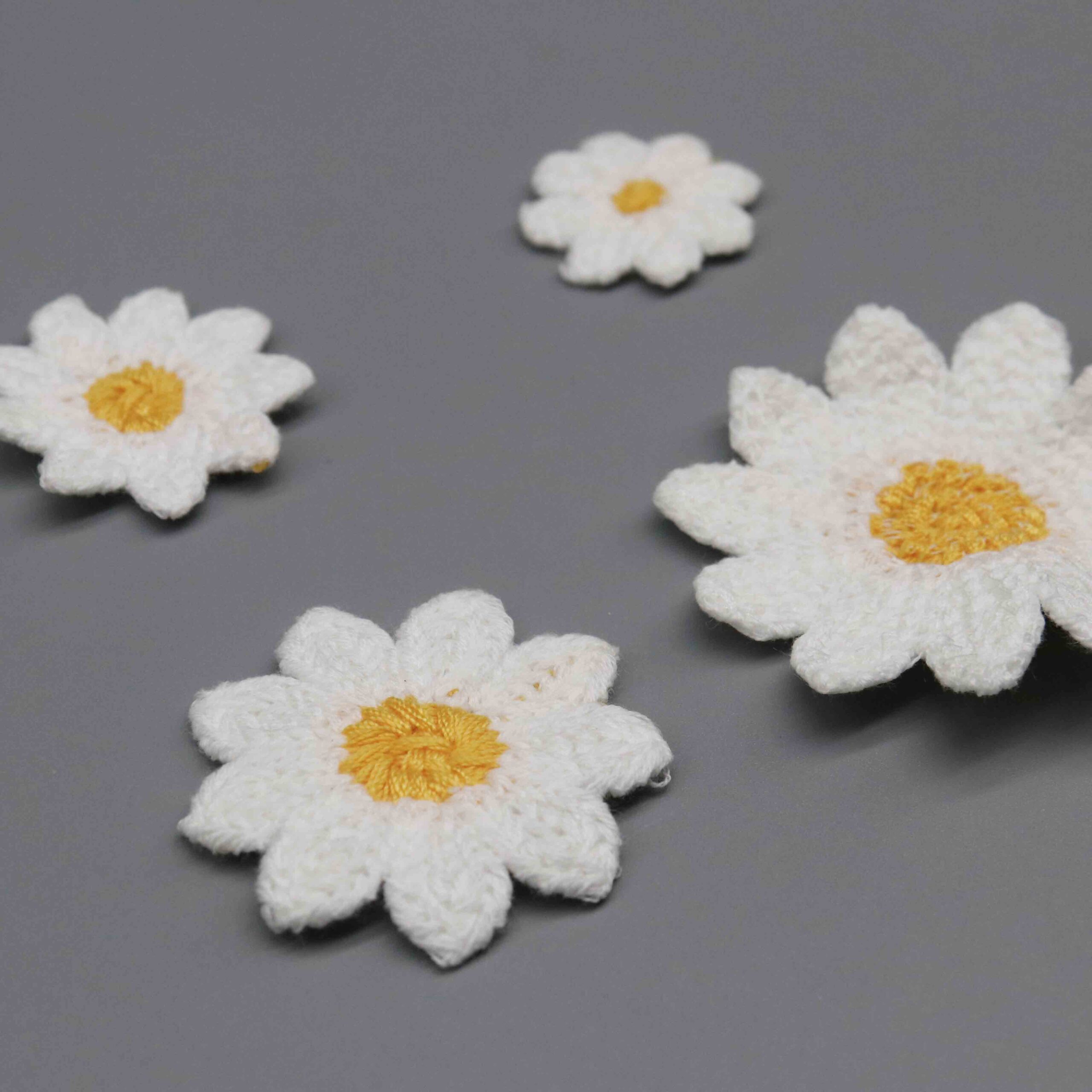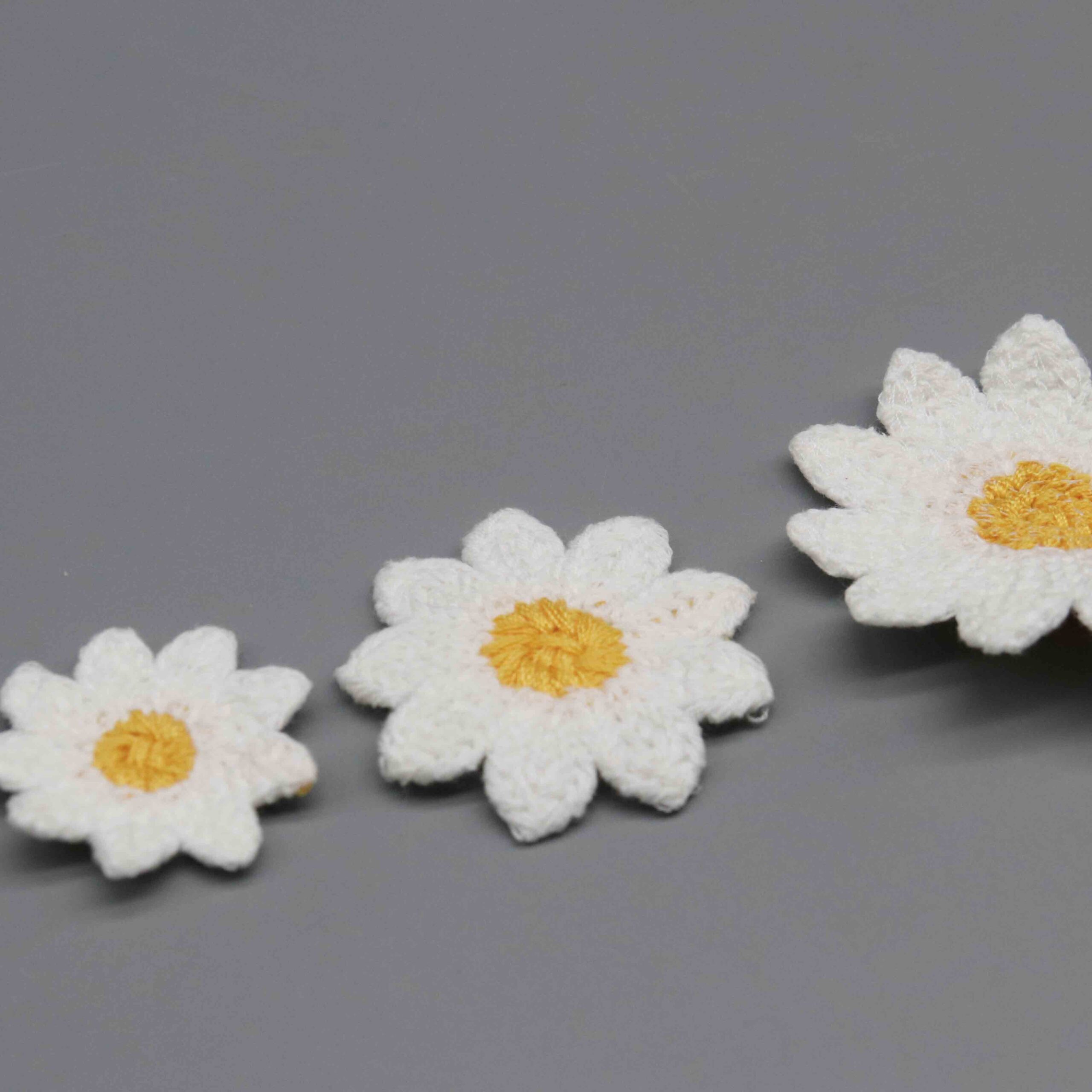 These appliqués serve explosive demand across multiple markets: children’s wear manufacturers seeking playful embellishments, accessory brands creating hair clips and headbands, craft suppliers targeting DIY enthusiasts, and home décor producers adding floral accents to cushions and linens. The universal daisy motif maintains year-round appeal with seasonal spikes during spring collections. Ready-to-apply format dramatically reduces production time versus custom embroidery.