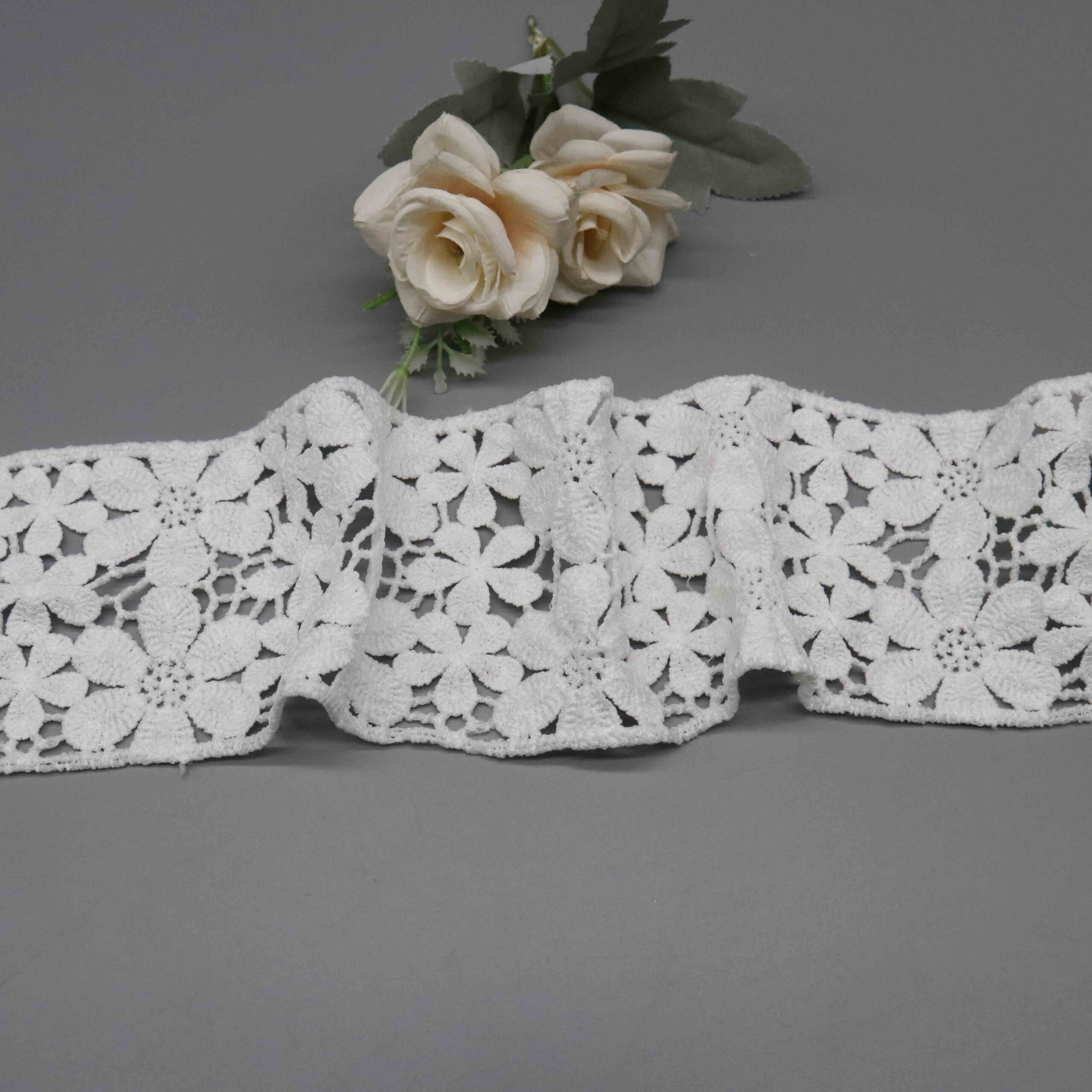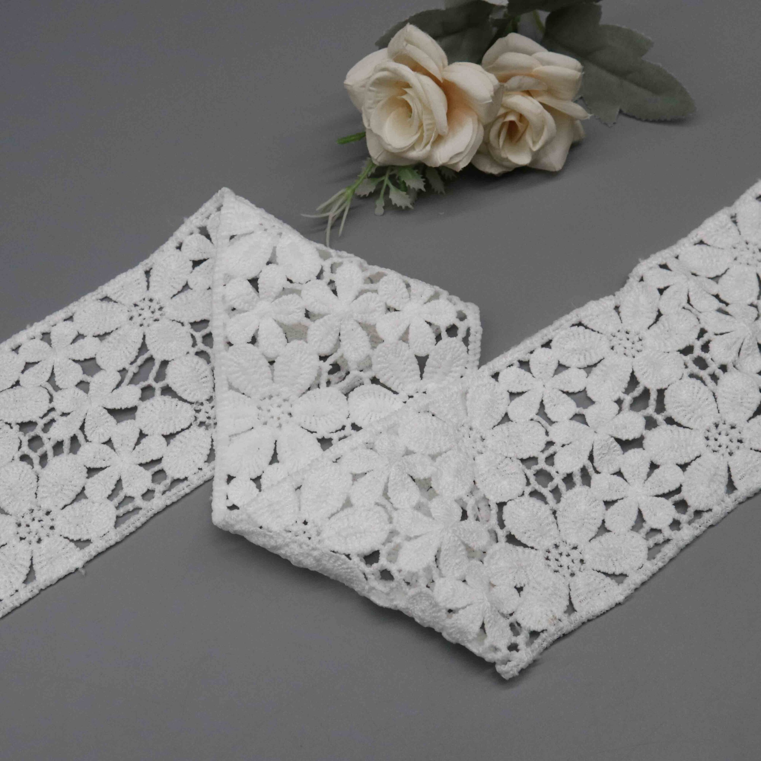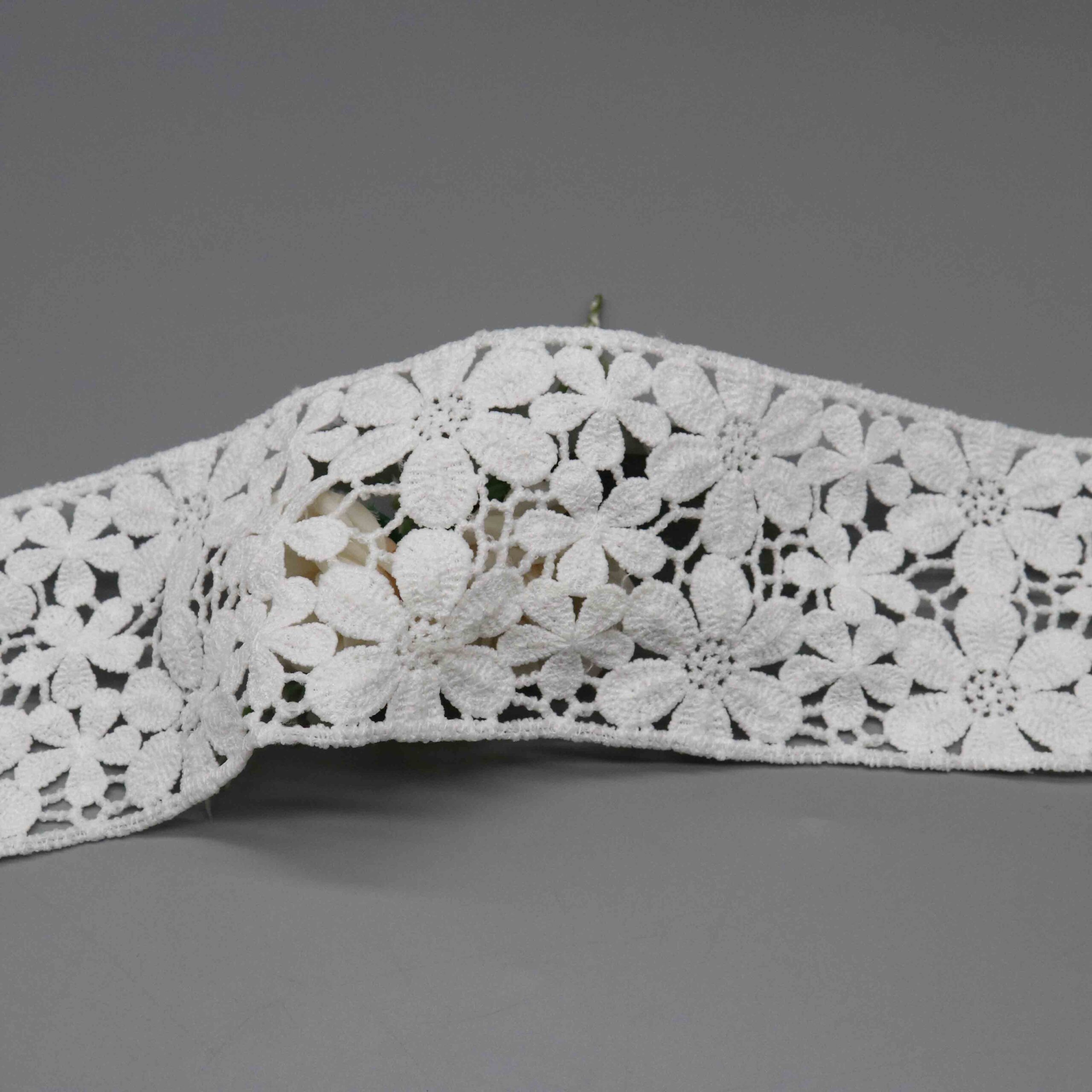This Botanical Garden Polyester Lace Trim delivers extraordinary visual richness through its dense, multi-layered floral composition. Large statement flowers with satin-stitched petals interweave with smaller daisy accents and richly textured leaf clusters, all connected by delicate honeycomb mesh ground. The 100% polyester milk fiber construction creates remarkable dimensional depth while maintaining the soft, luxurious hand-feel essential for fine garments. The 8.5cm width provides substantial decorative impact.