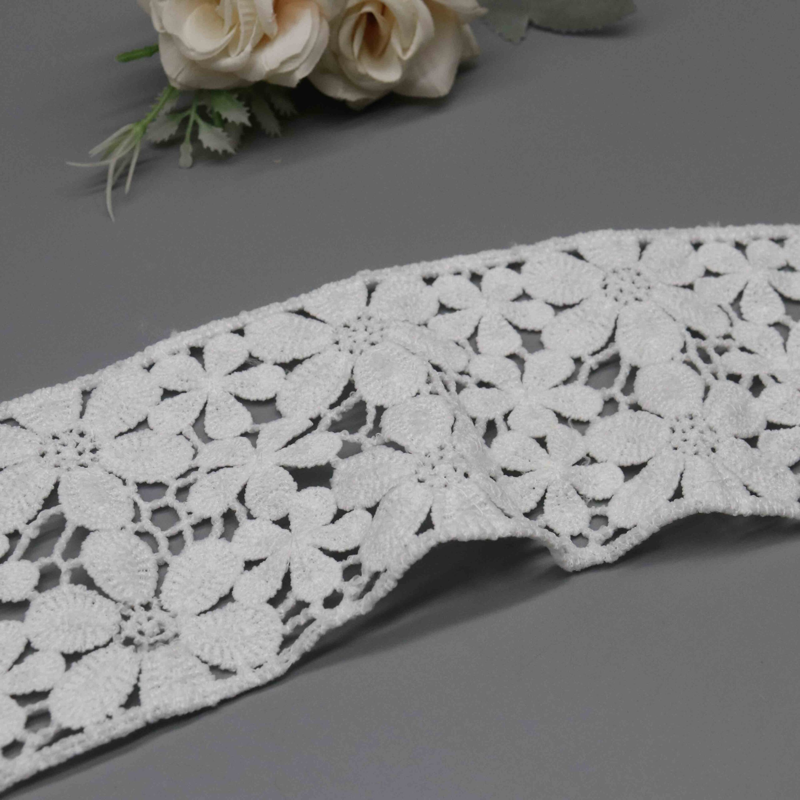 This trim commands premium positioning in bridal and occasion wear markets where customers invest in distinctive detailing. The all-over botanical pattern offers exceptional versatility—use as traditional edge trim, insert panels, or cut individual motifs for appliqué work. The dense embroidery photographs with stunning dimension, elevating your product imagery for maximum online conversion.
