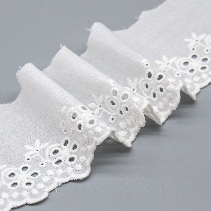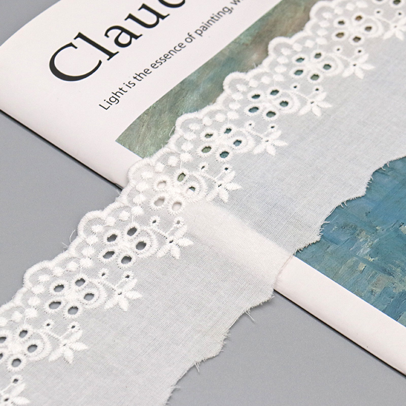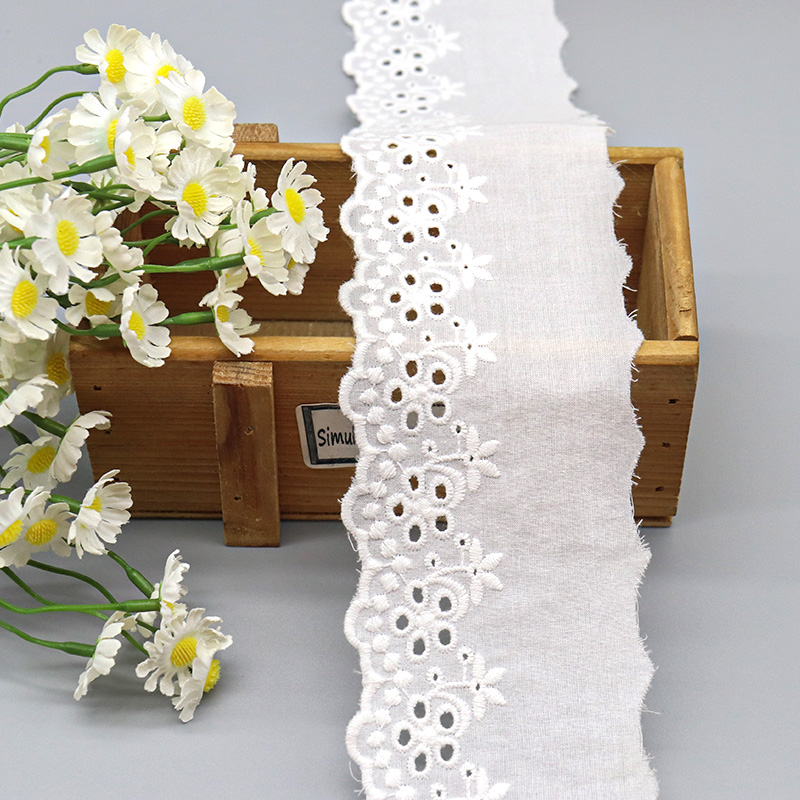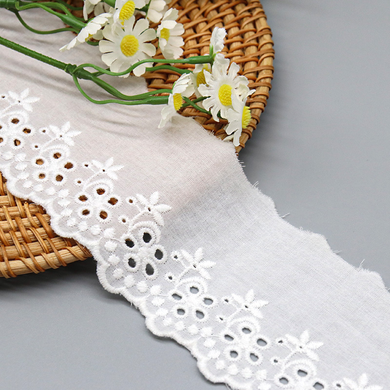 This Broderie Anglaise Cotton Eyelet Embroidery Lace Trim showcases traditional schiffli-style embroidery with clustered daisy motifs, pierced eyelet circles, and delicate leaf accents on a crisp 100% cotton ground. The punched eyelets feature reinforced satin-stitch borders preventing fraying and maintaining shape through production and washing. A gently scalloped bottom edge follows the floral design contours while the straight top edge facilitates clean seam attachment.