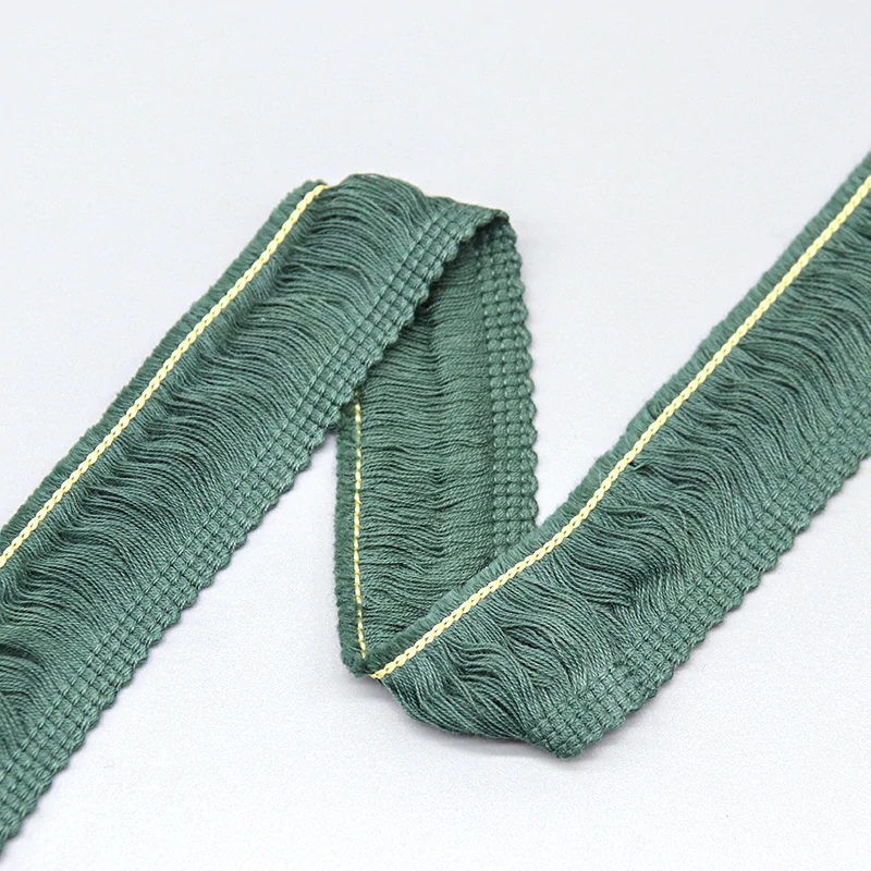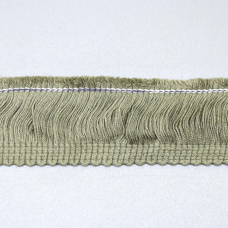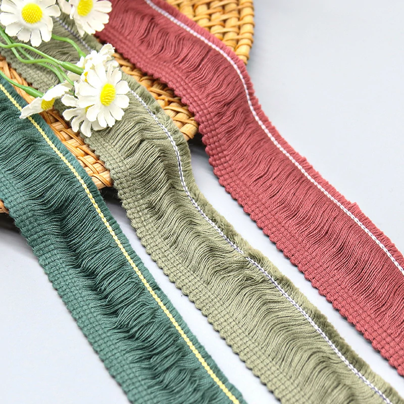 This Brushed Wave Cotton Fringe Lace Trim features densely packed soft cotton strands attached to a sturdy woven header band with decorative contrast stitching. The 3.2cm width delivers substantial visual impact while remaining lightweight at just 9 grams per yard. Available in a curated palette of earthy tones including dusty rose, sage green, and deep forest green, each colorway is designed to complement current bohemian and natural home décor trends.