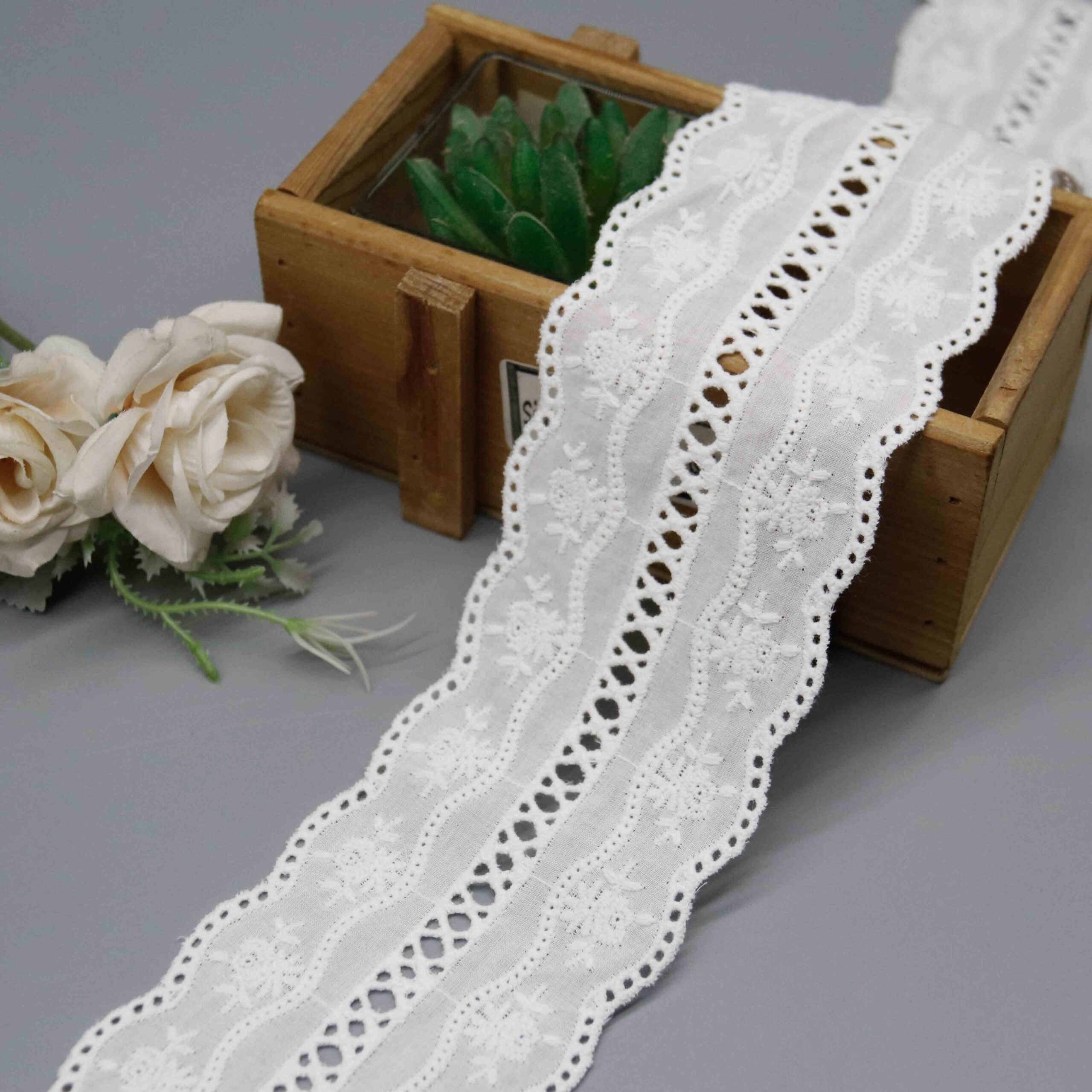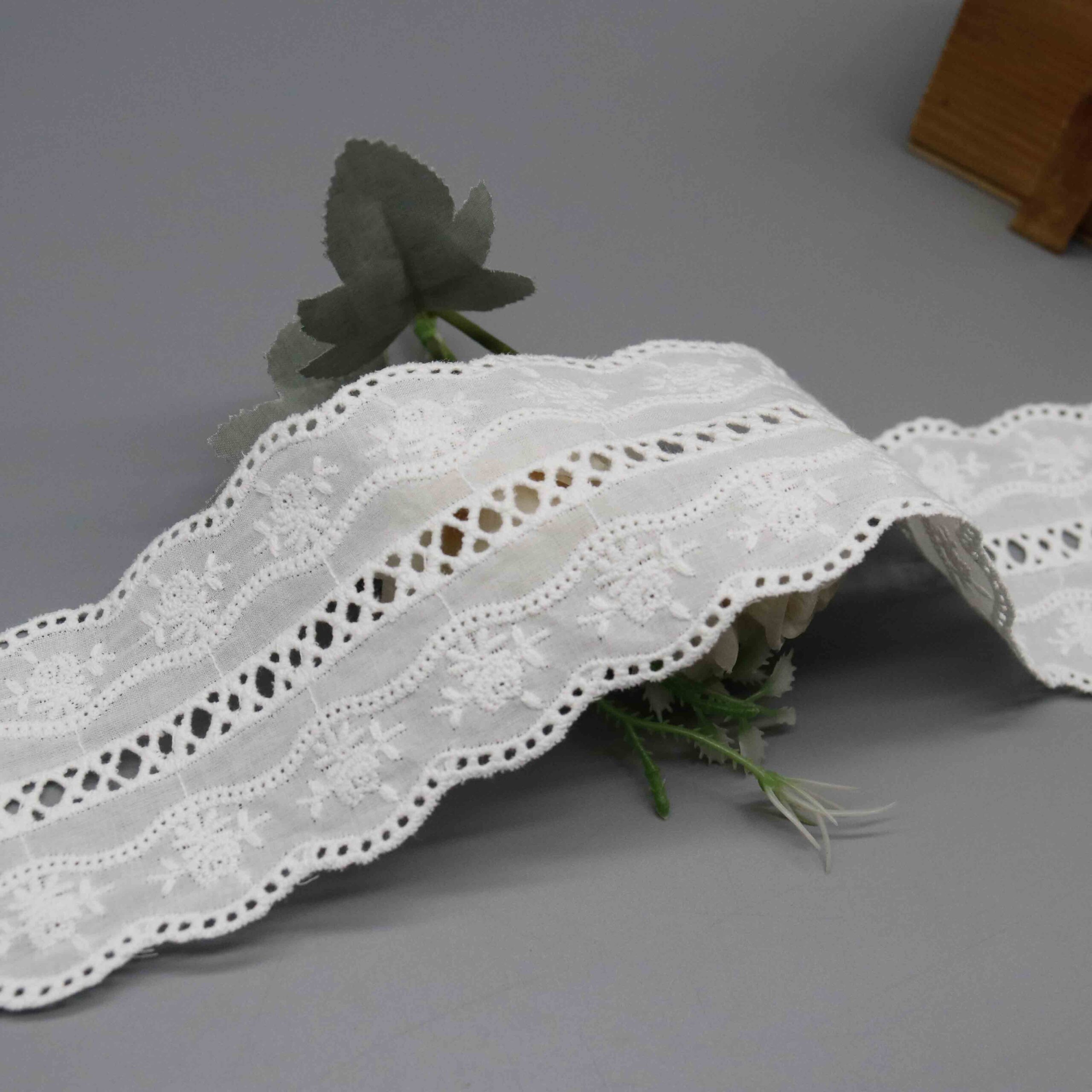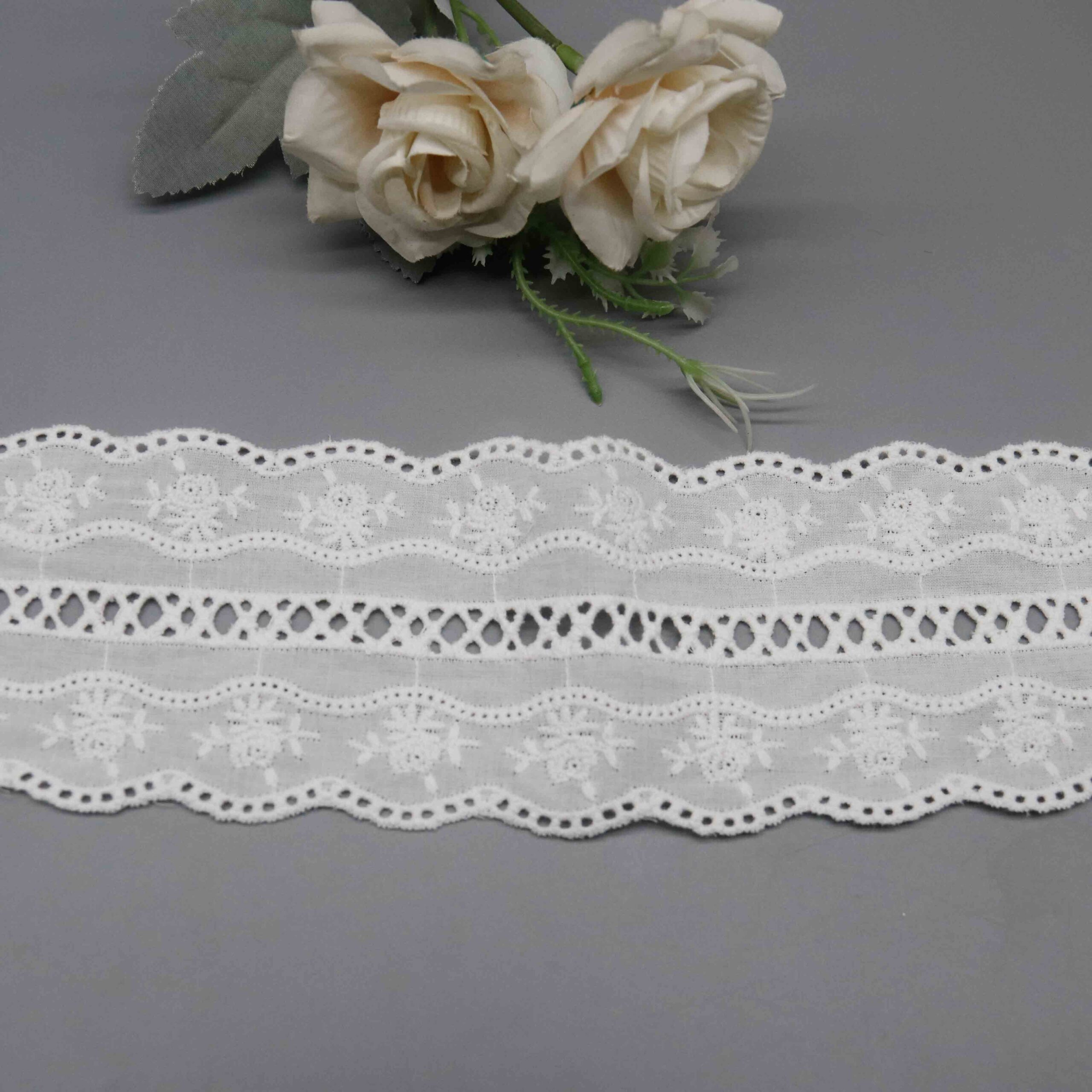 This trim anchors seasonal collections across multiple markets: women’s ready-to-wear, children’s apparel, and home textiles. Eyelet embroidery maintains perennial popularity as a summer staple, ensuring reliable year-over-year demand. The lightweight construction drapes beautifully on flowing silhouettes while the clean cutwork details photograph with excellent clarity for e-commerce presentation.