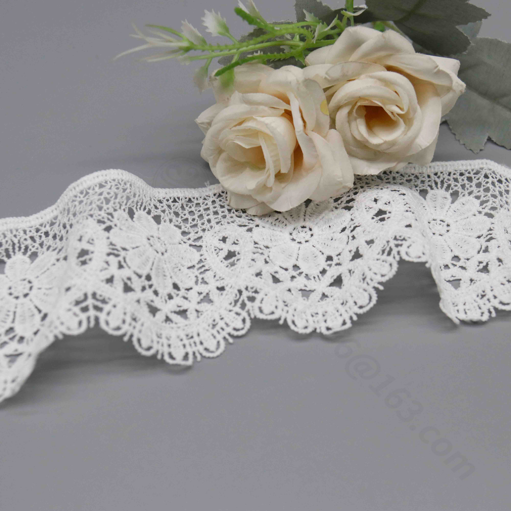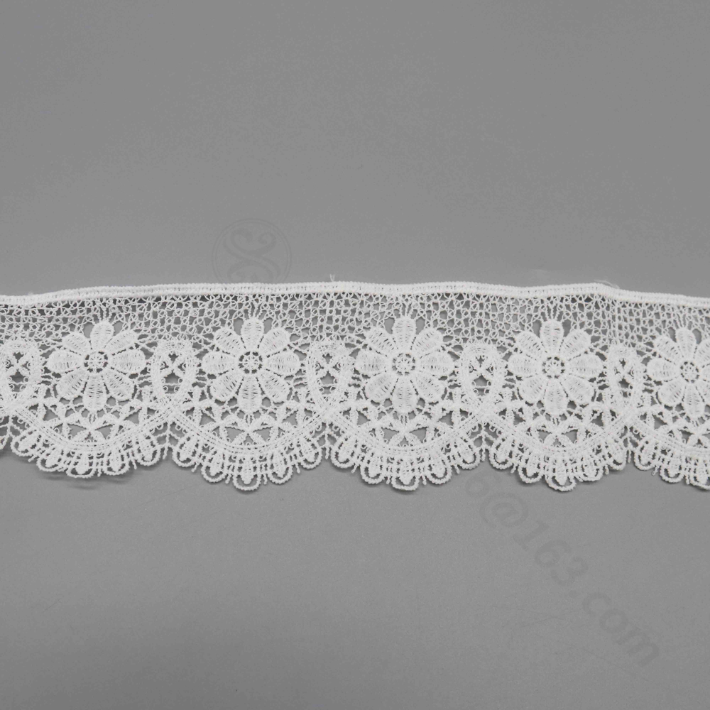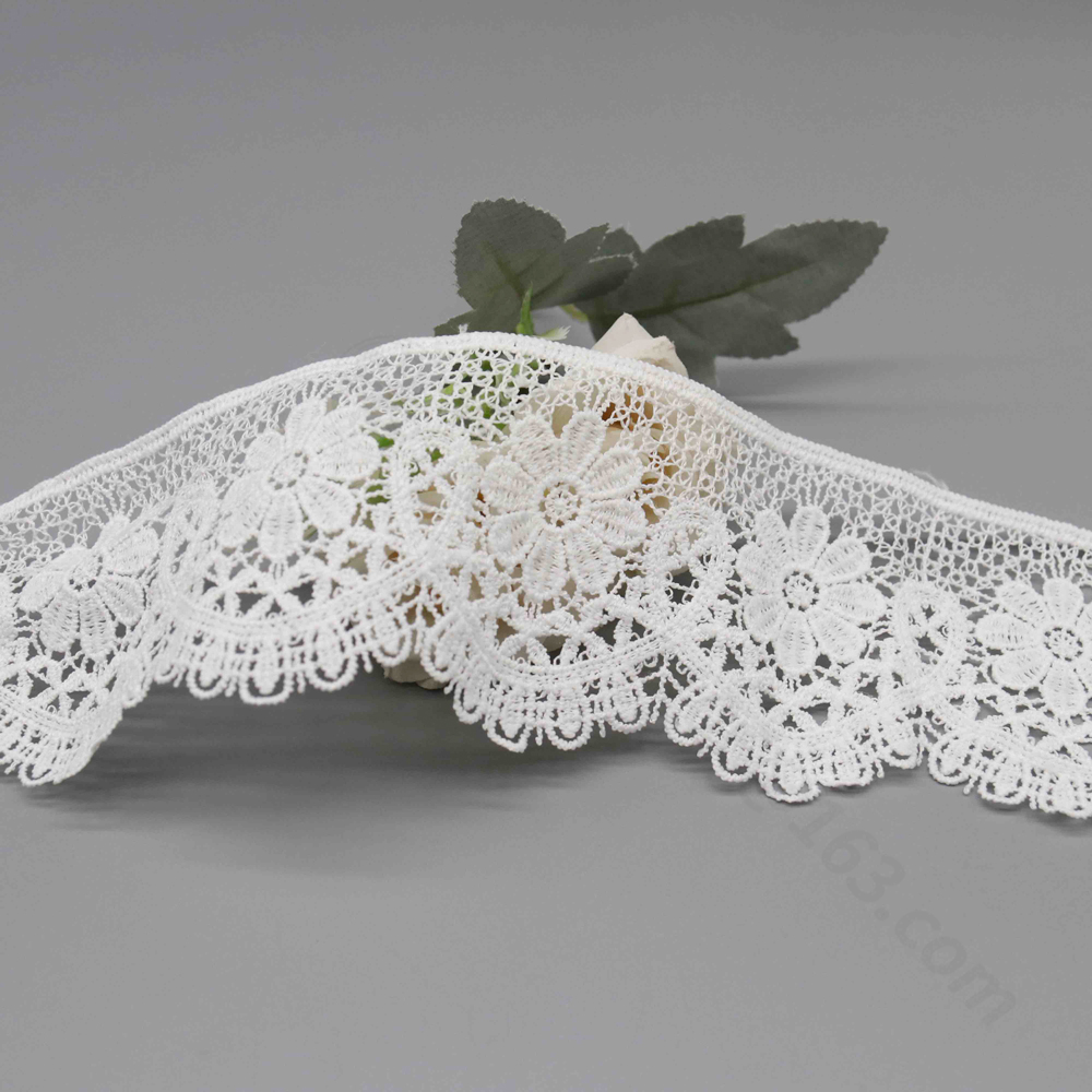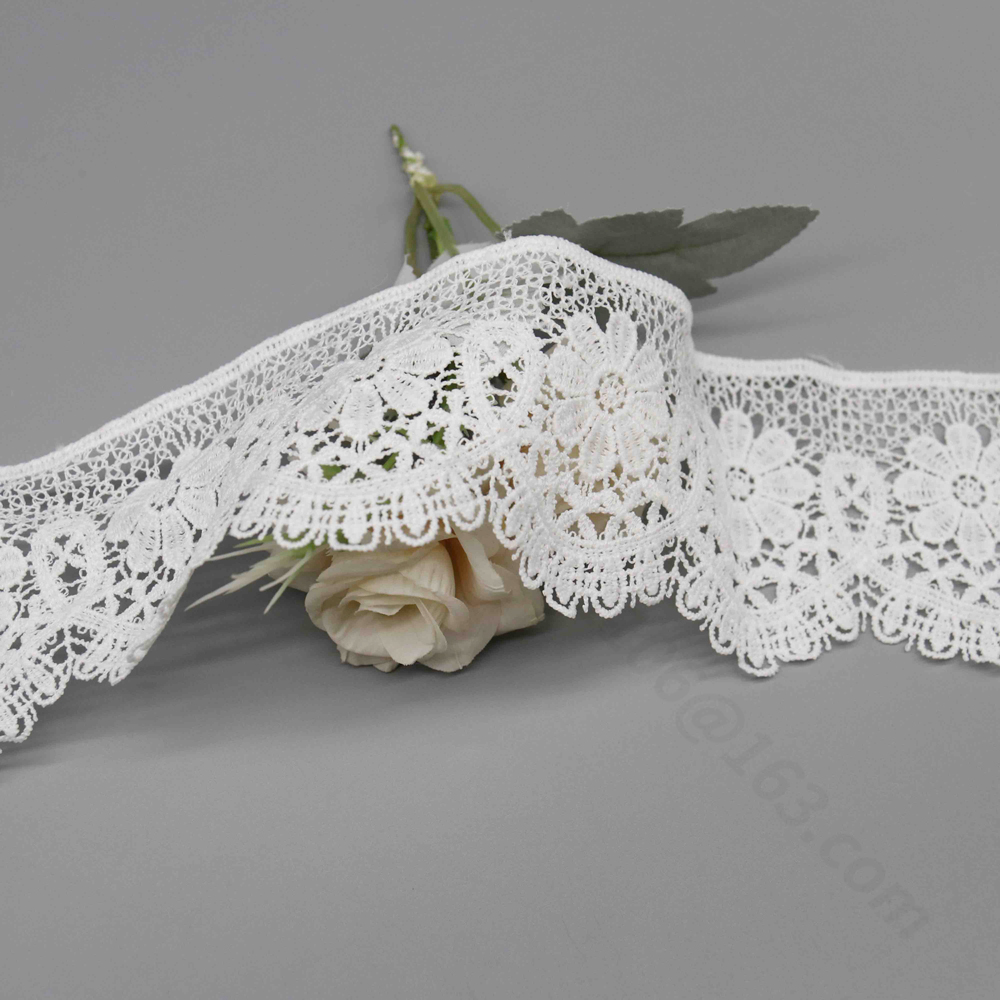 Characteristics: Substantial 7.6cm width provides dramatic visual impact. Water-soluble construction ensures clean openwork with maximum transparency in the mesh sections. The contrast between dense floral areas and open lattice creates exceptional dimensional depth. Soft drape with gentle body — luxurious against skin.