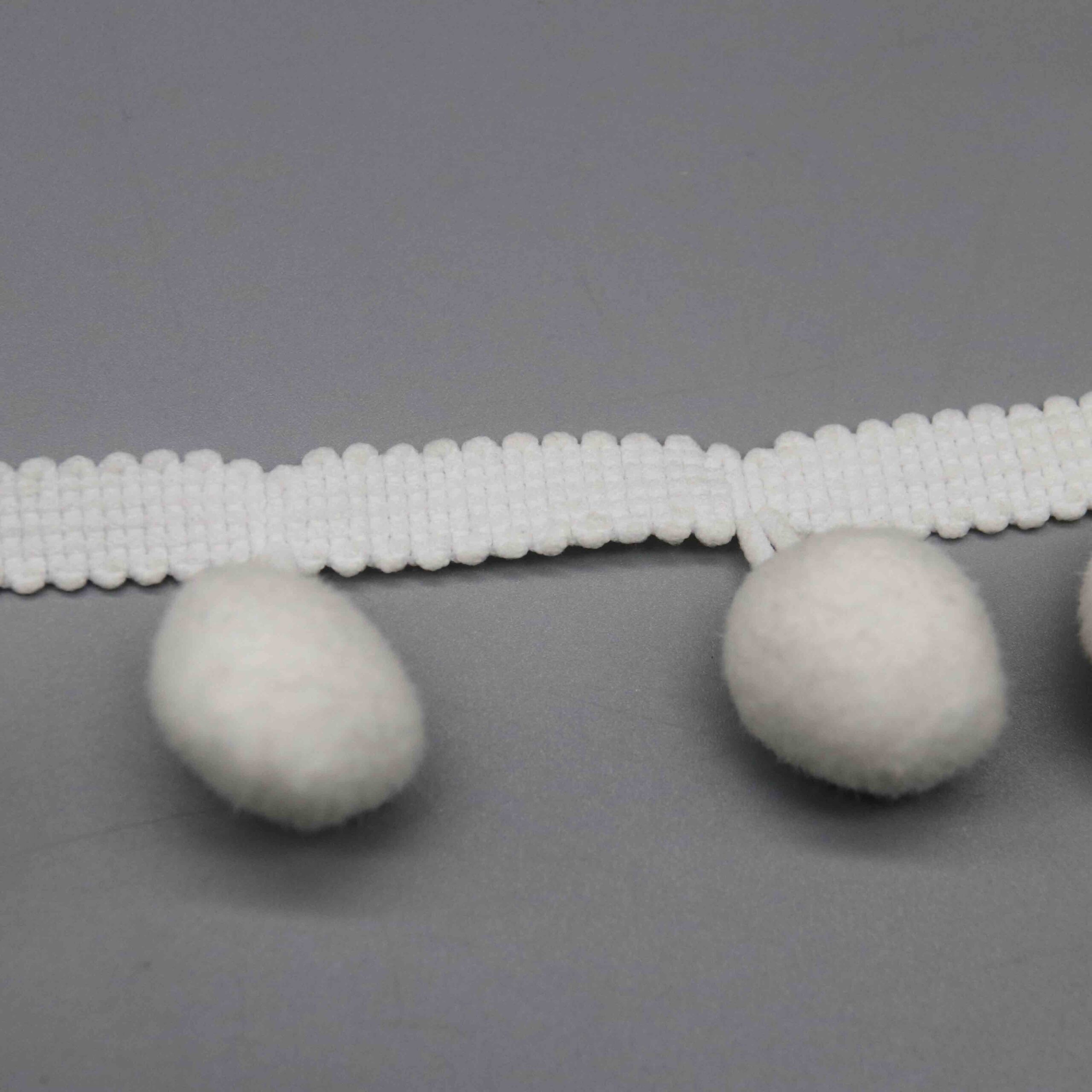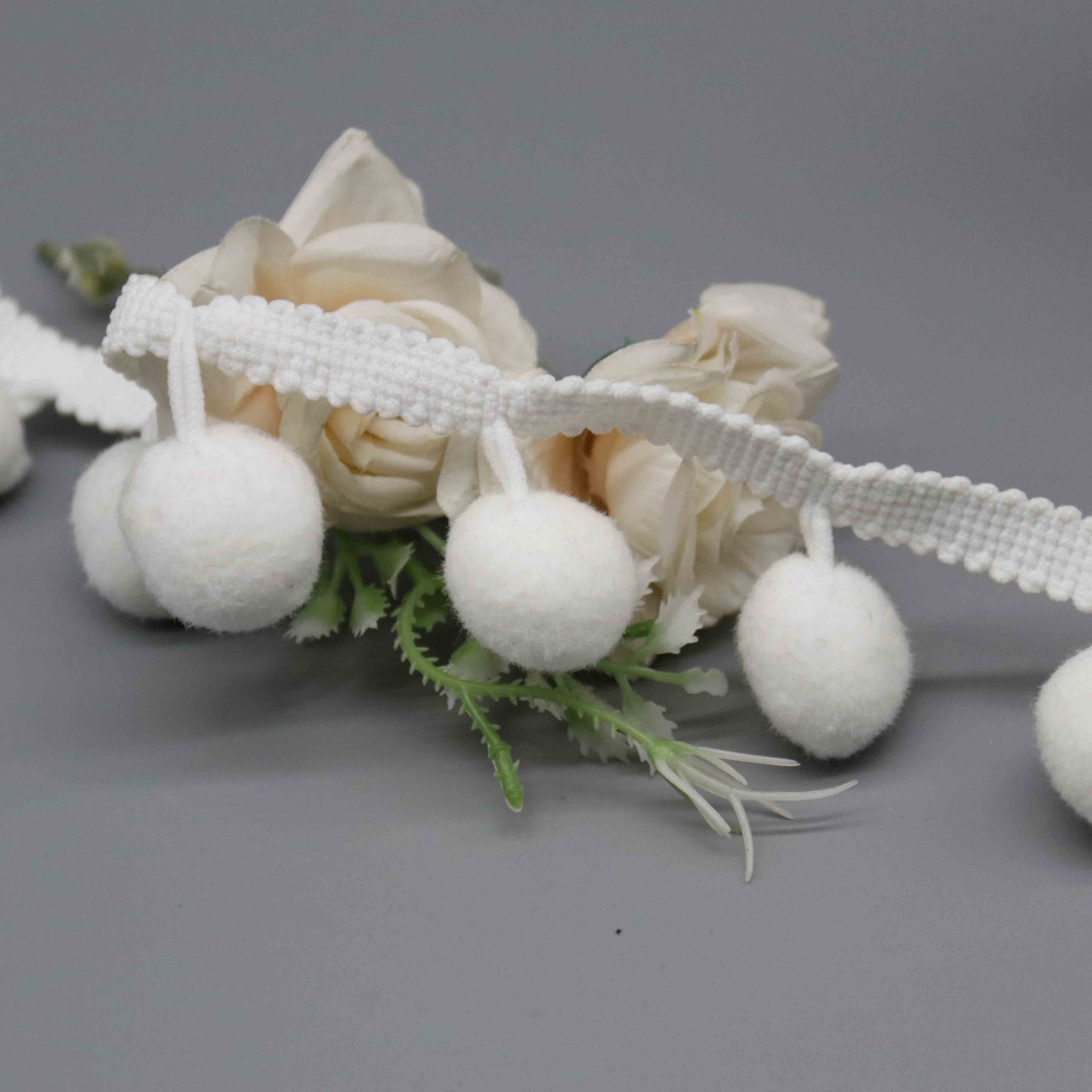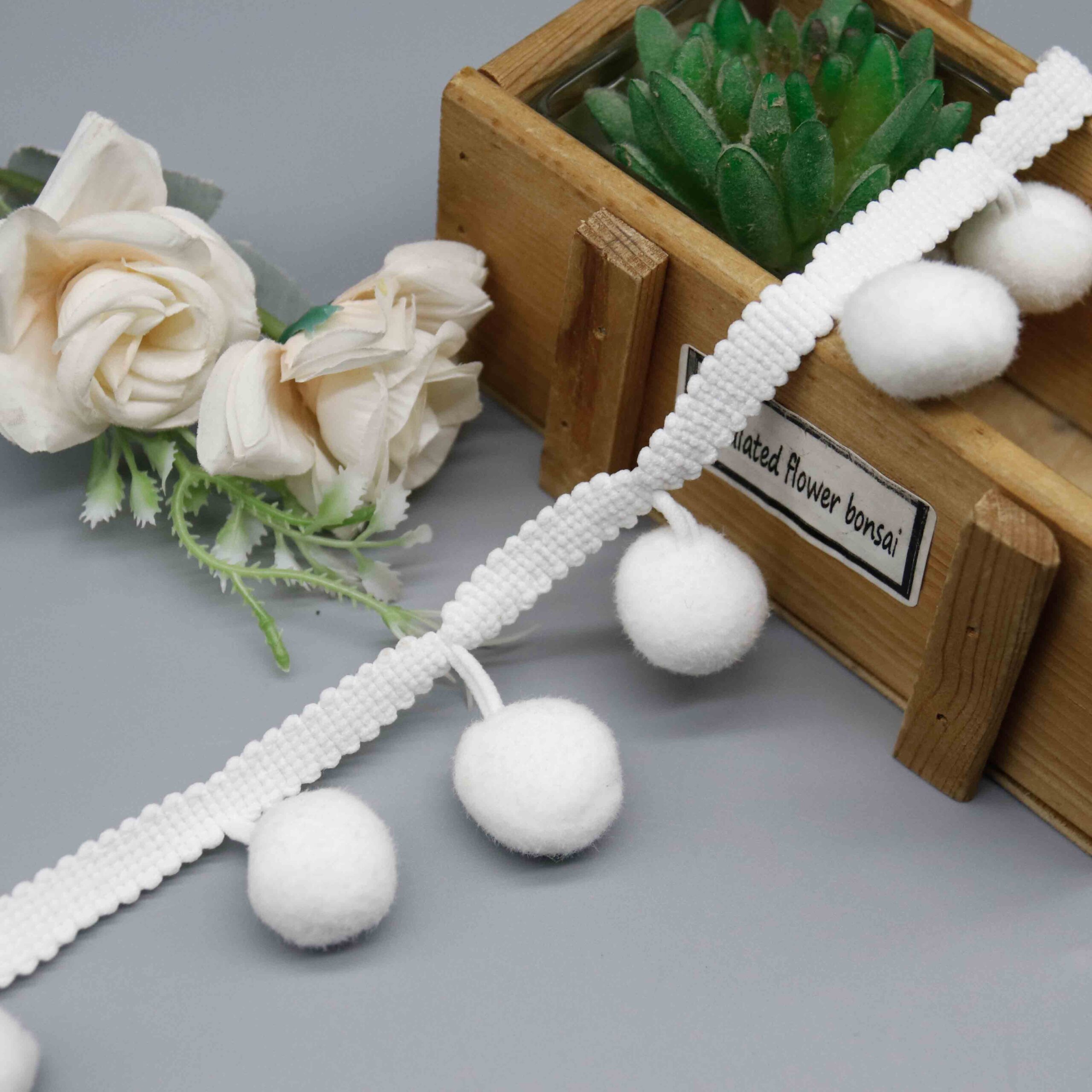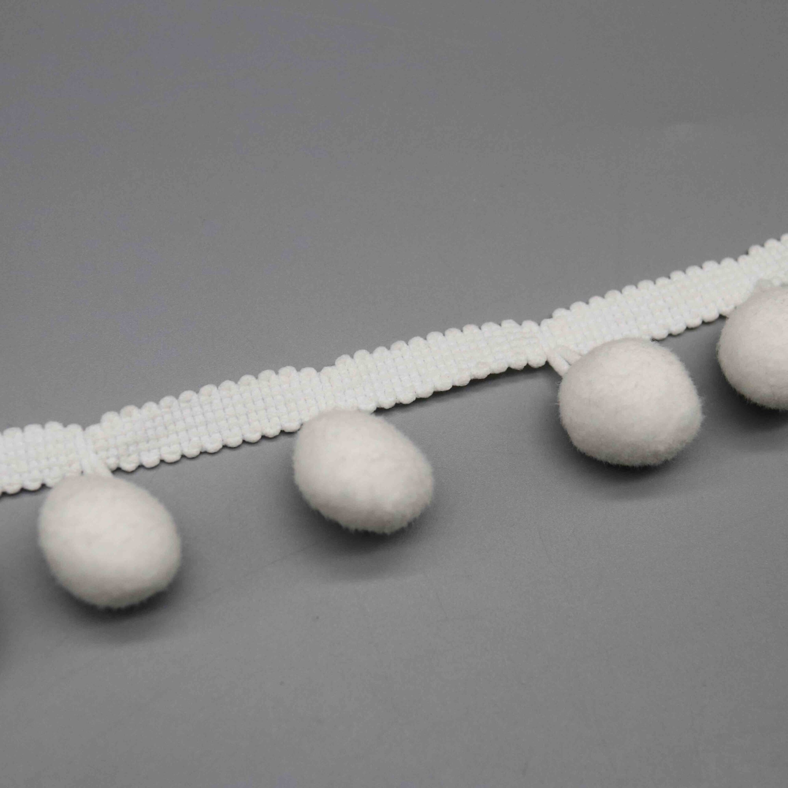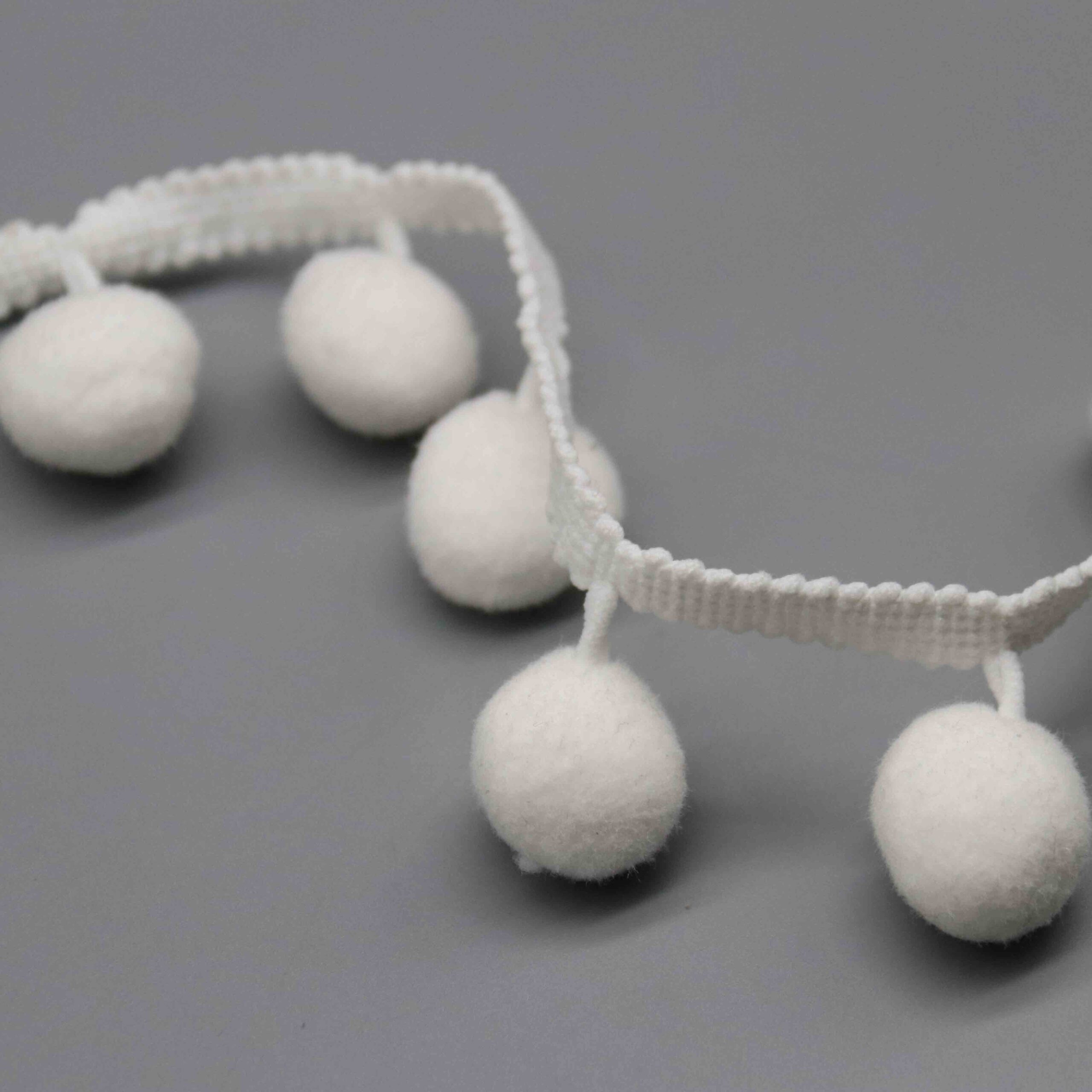 Large-format pompom trims address growing demand for statement embellishments in home décor and fashion accessories markets. Interior designers seek bold textural elements for bohemian and maximalist styling, while fashion brands incorporate oversized pompoms into bags, footwear, and outerwear for playful visual impact. The pure white colorway serves as versatile base stock or accepts custom dyeing for seasonal color requirements.
