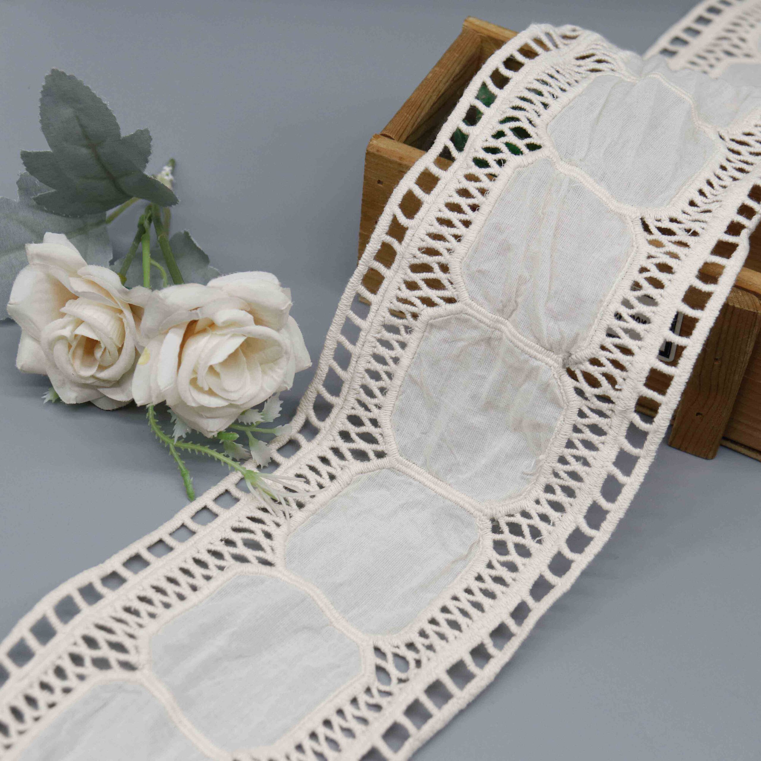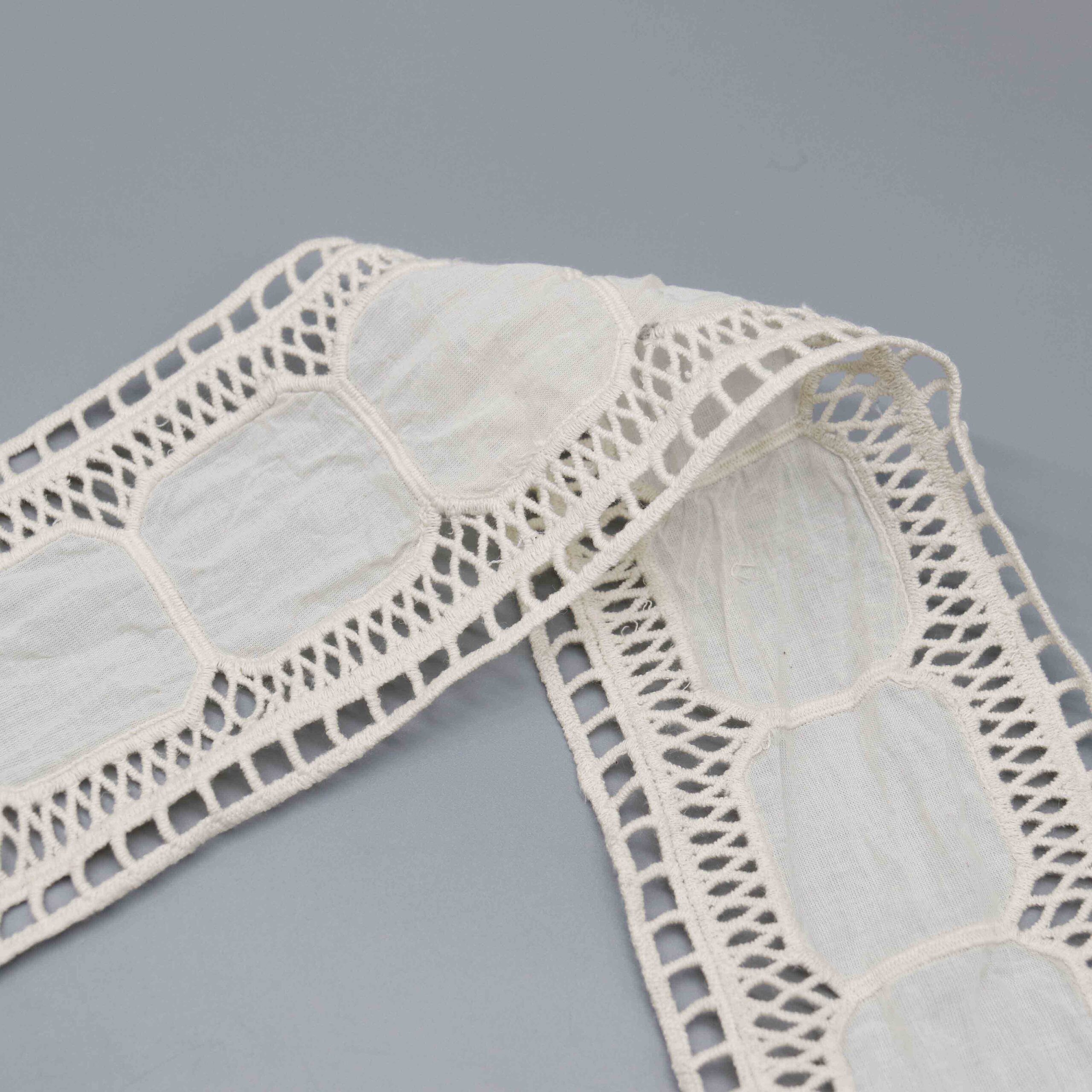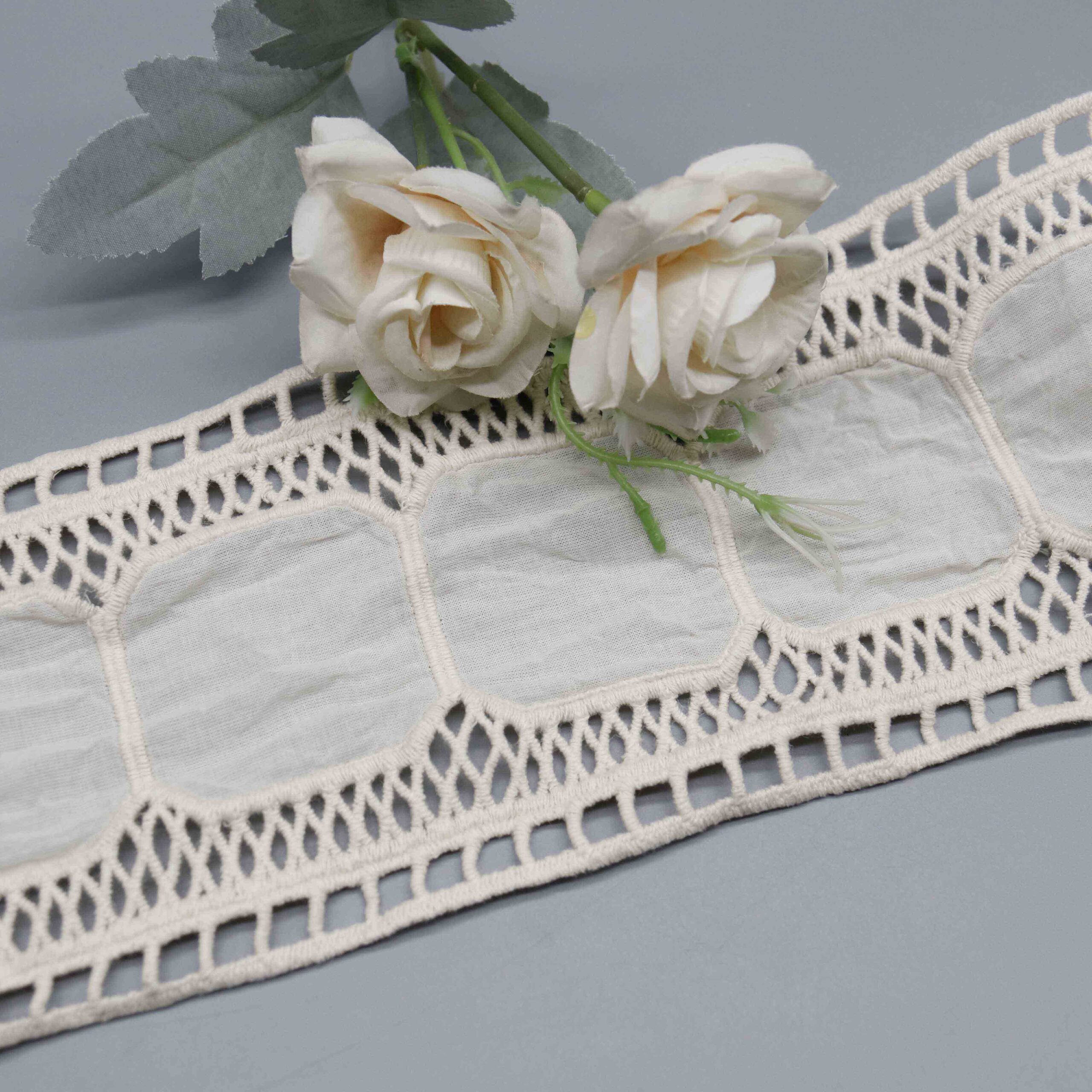 This Lattice Frame Cotton Insertion Lace presents a refined geometric composition with sheer cotton lawn rectangles elegantly bordered by twisted ladder-stitch openwork and finished with eyelet header detailing. The 100% cotton construction through precision laser embroidery delivers crisp, consistent pattern definition with the natural breathability and soft hand-feel essential for quality textiles. The 10.3cm width provides substantial decorative presence for insertion applications.
