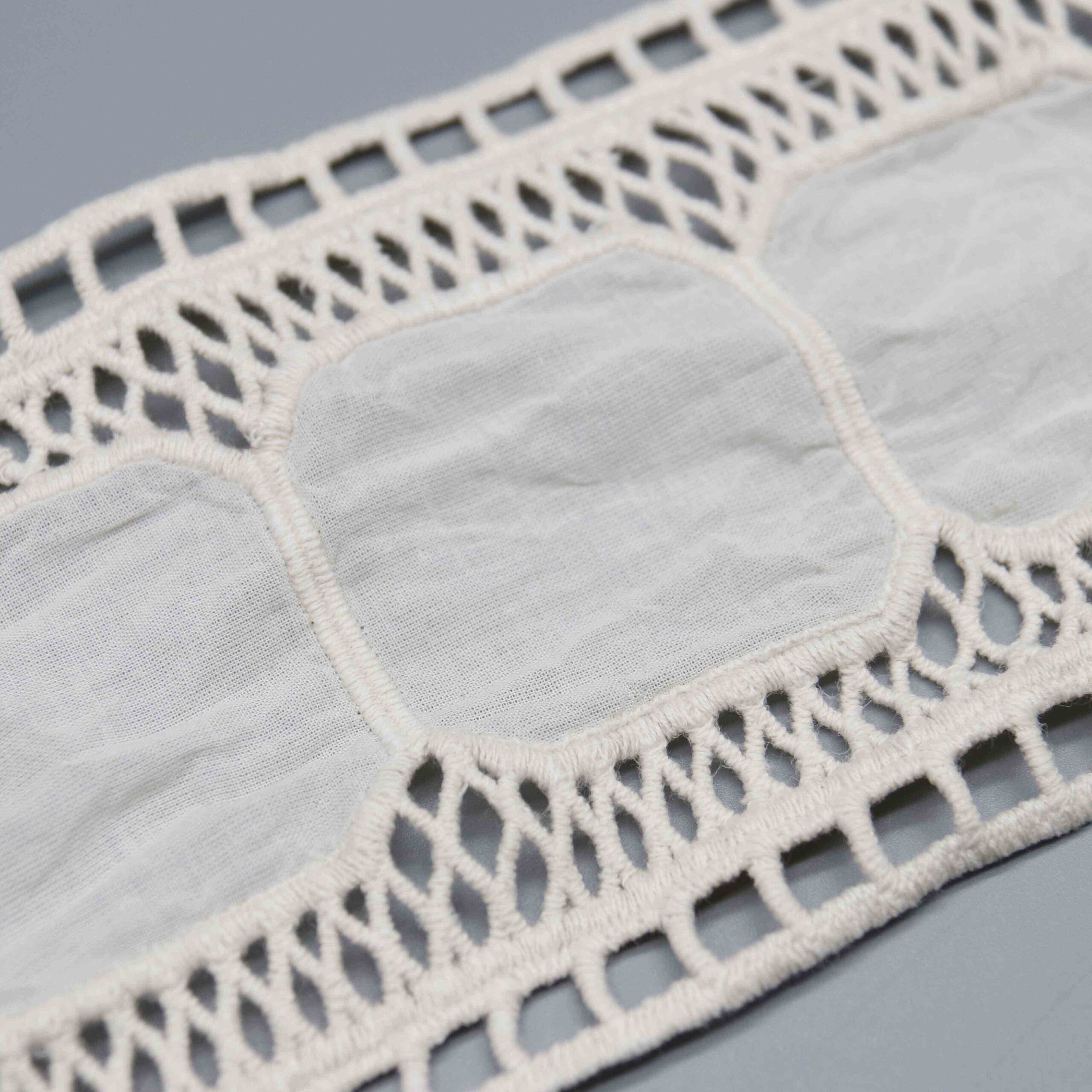Our laser embroidery production ensures precision-cut openwork and consistent twisted-thread detailing across production runs. No minimum order requirements accommodate both sampling and bulk purchasing, with ready stock available for immediate dispatch. Natural cotton accepts dye exceptionally well for custom ecru, ivory, and heritage tone requests.