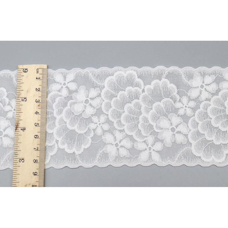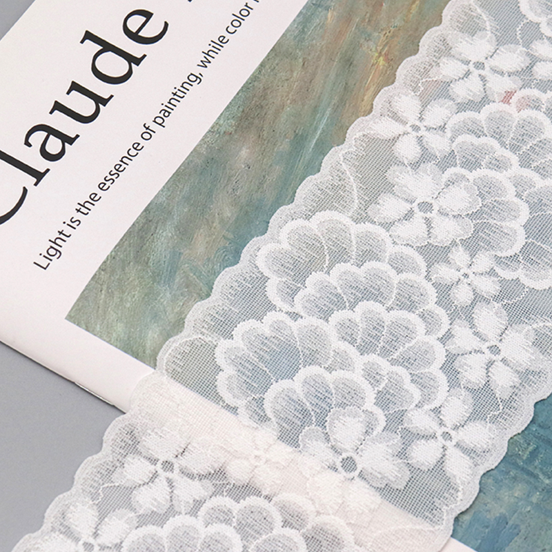 Characteristics: Substantial 8.5cm width provides excellent coverage for lingerie bands and decorative panels. Ultra-soft hand-feel — notably gentler than standard stretch lace, ideal for skin-contact applications. Lightweight construction (0.011kg per unit) ensures comfort without bulk. Semi-sheer mesh base with raised floral embroidery creates beautiful textural contrast.