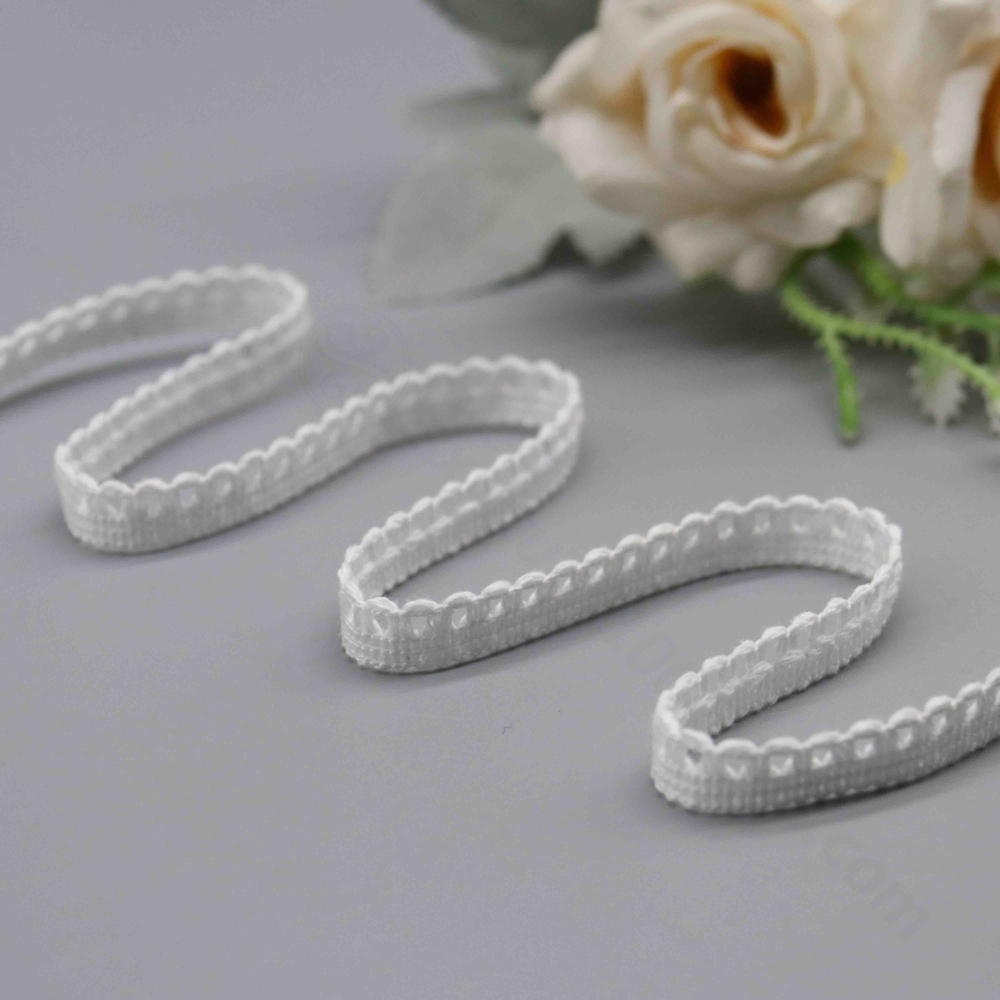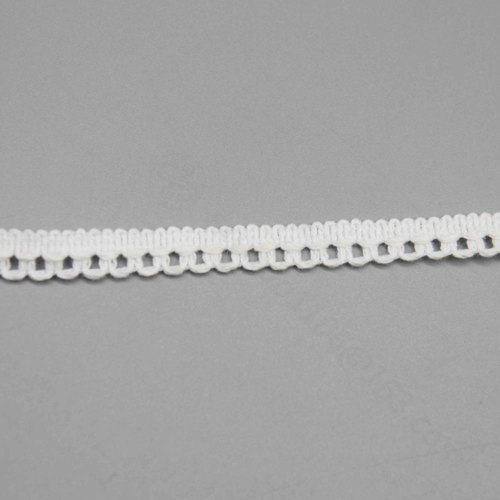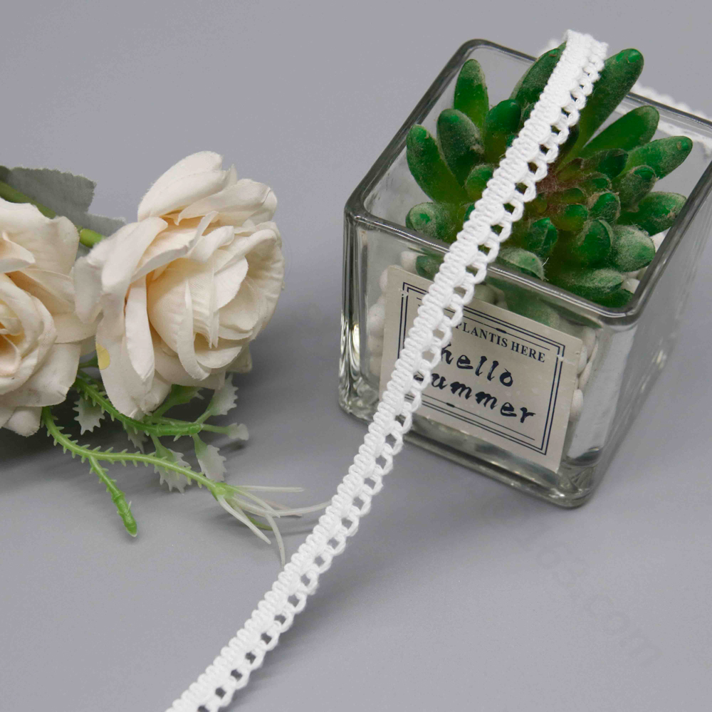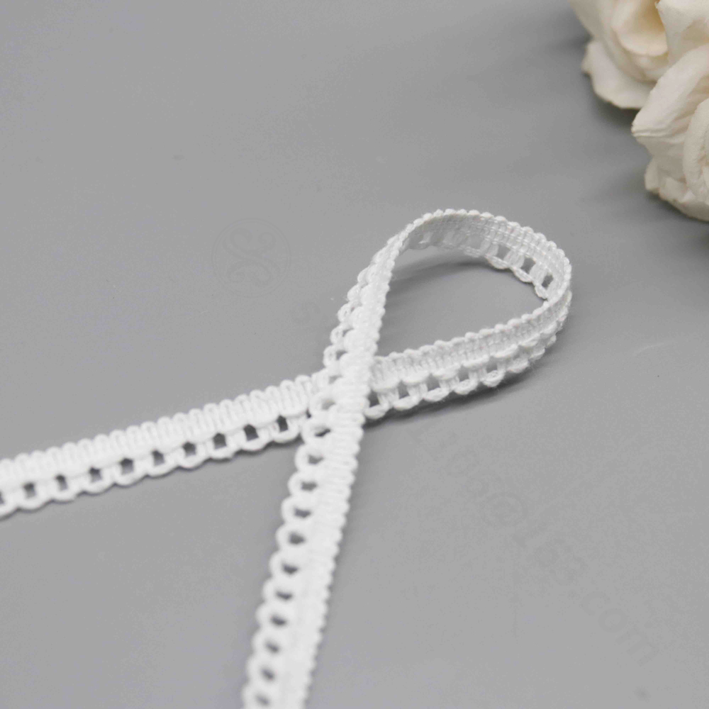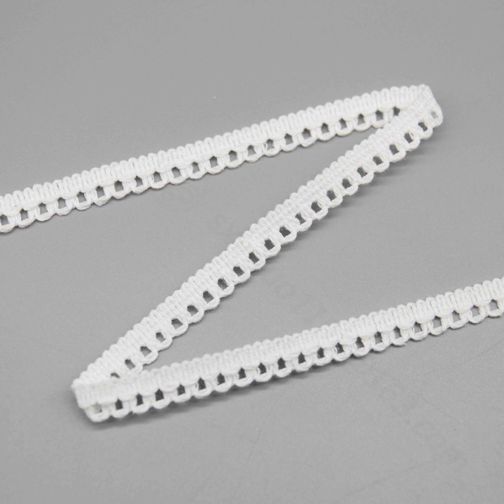 Name & Style: A classic picot loop lace trim featuring a flat woven center band with symmetrical decorative loops extending from both edges. The design is clean, geometric, and universally appealing — a staple in traditional sewing and craft markets worldwide.