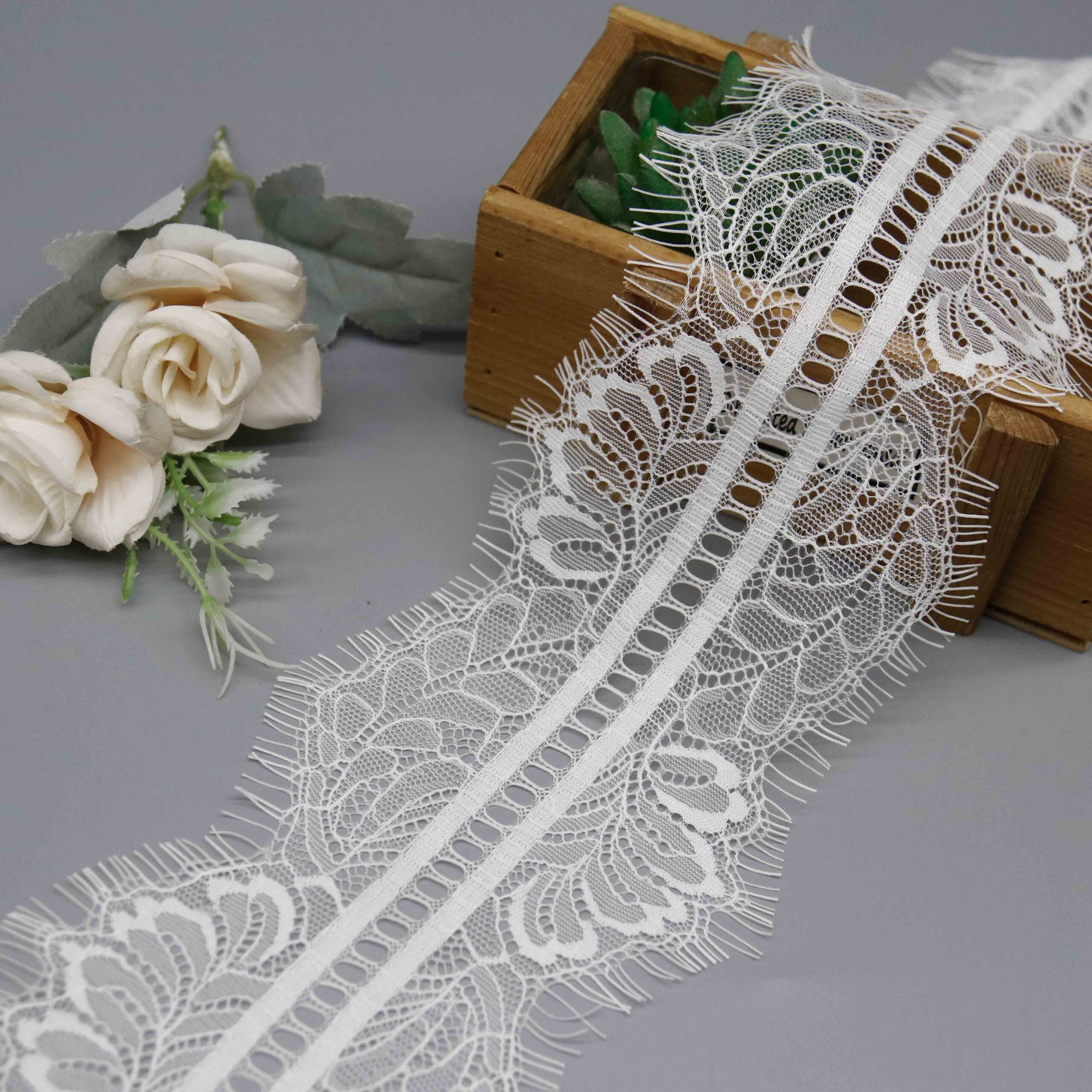 This Romantic Floral Chantilly Eyelash Lace Trim showcases intricate rose and peony scrollwork patterns rendered in lustrous 100% nylon thread on a fine mesh ground. The distinctive dual-band horizontal insertion with oval openwork creates visual interest and structural definition. Each edge features signature eyelash fringe with delicate wispy thread extensions that deliver the soft, romantic finish demanded by premium lingerie and bridal markets.