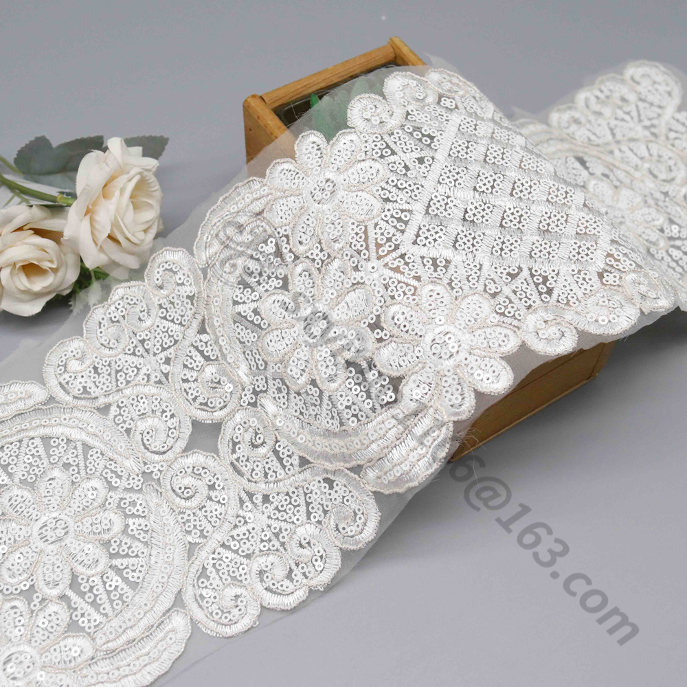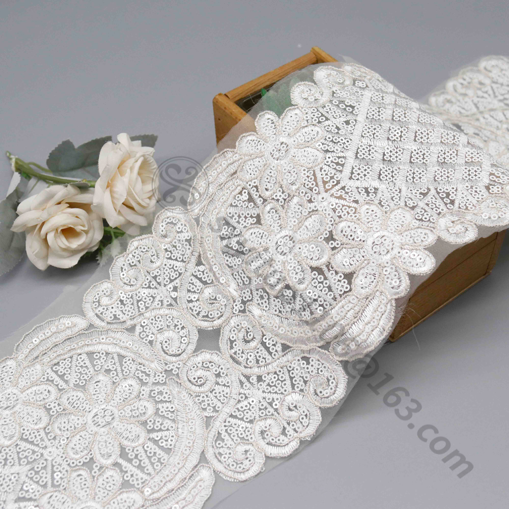 Characteristics: Generous 14cm width commands attention on any garment. The dense sequin coverage creates substantial weight and body — this is statement trim, not subtle accent. Sheer mesh base allows skin or lining to show through the unembroidered areas, creating beautiful depth. The multi-tiered scalloped edge requires no additional finishing.
