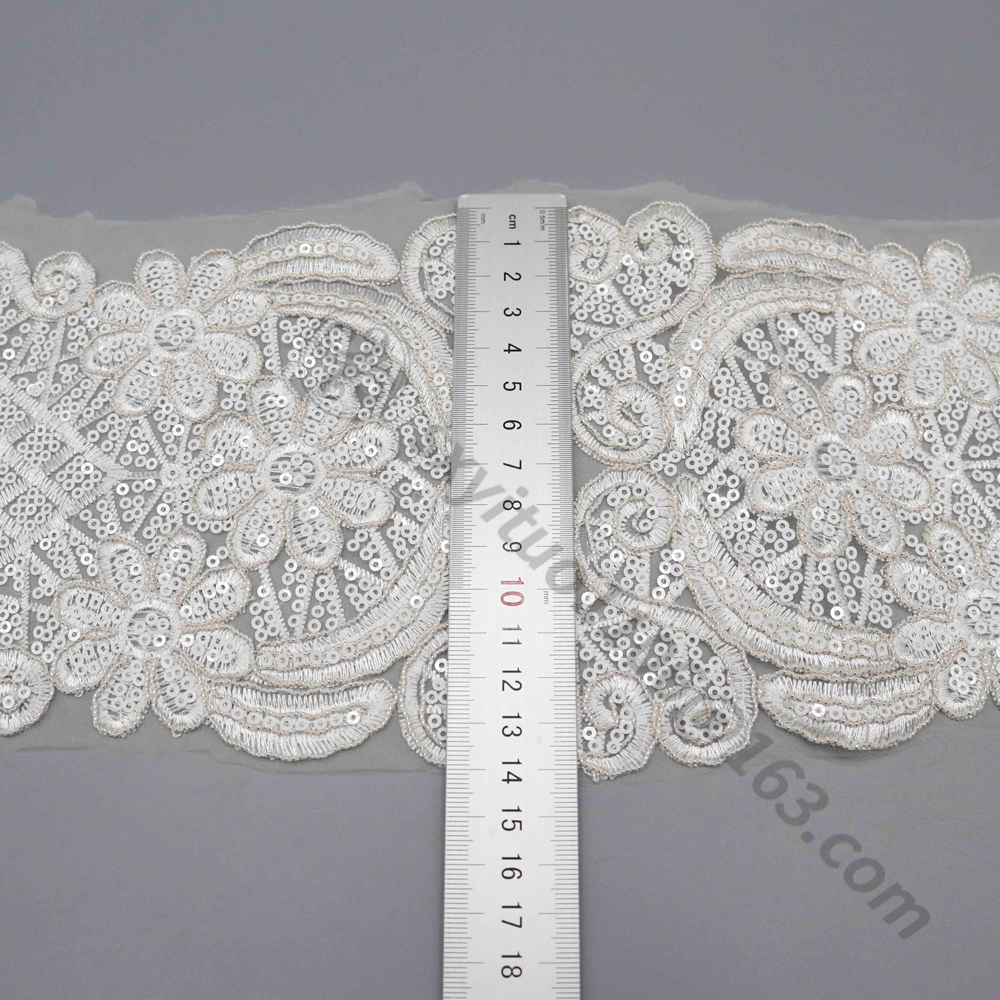 Name & Style: A spectacular sequin-embellished lace trim featuring dramatic baroque rose motifs with swirling scroll accents. Each floral element is densely covered with flat white sequins applied in concentric rows, creating continuous shimmer across the entire surface. Metallic cording outlines every petal and leaf, adding dimensional definition. The deeply scalloped edge cascades in layered petal waves for maximum visual drama.