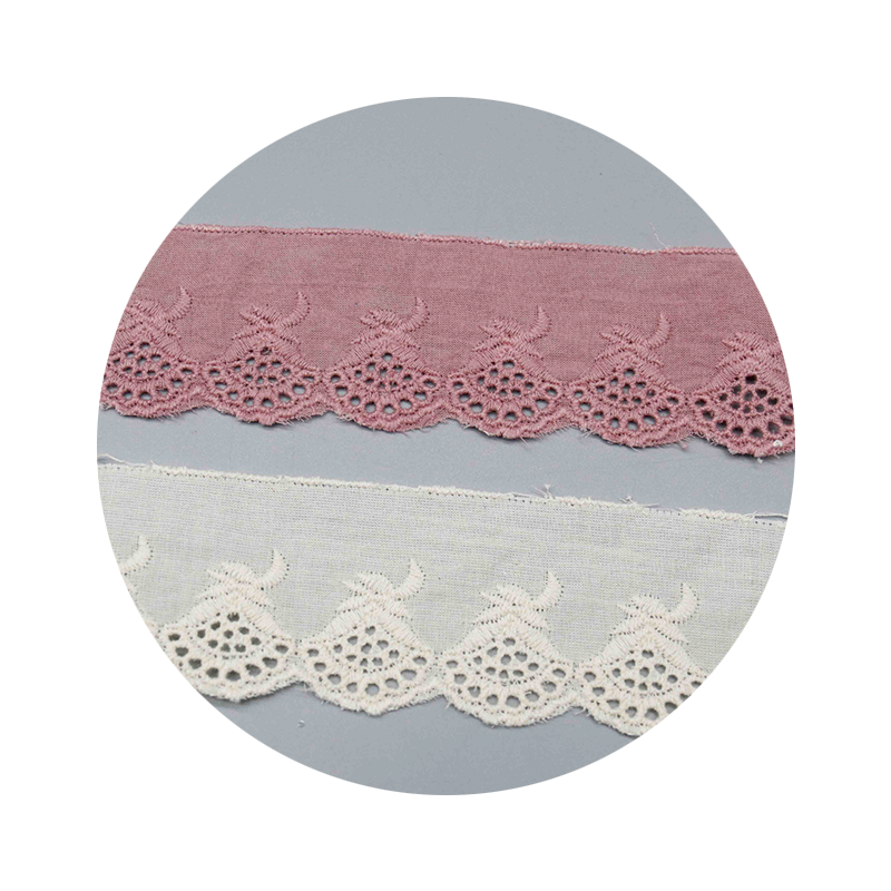 Available in two versatile colorways—romantic dusty pink and timeless off-white—this trim serves diverse market segments efficiently. The tone-on-tone embroidery creates sophisticated depth while maintaining versatile coordination with various fabric palettes. Classic eyelet design ensures consistent demand across seasons, making it a reliable inventory staple for retailers and manufacturers alike.